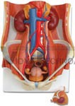 One front half of a kidney is removable from the anatomical model of the urinary system. With easy to change male insert (bladder and prostate, front and rear half) and female insert (bladder, womb and ovaries, 2 lateral halves) the Urinary System model is a great teaching tool. Parts are numbered on the Dual Sex Urinary System.