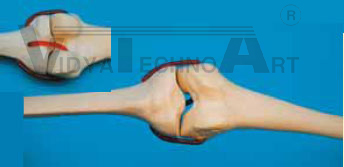 Left Knee with Femur and Tibia with red rope ligaments incl. PCL. Canal openings closed with cancellous bone |
